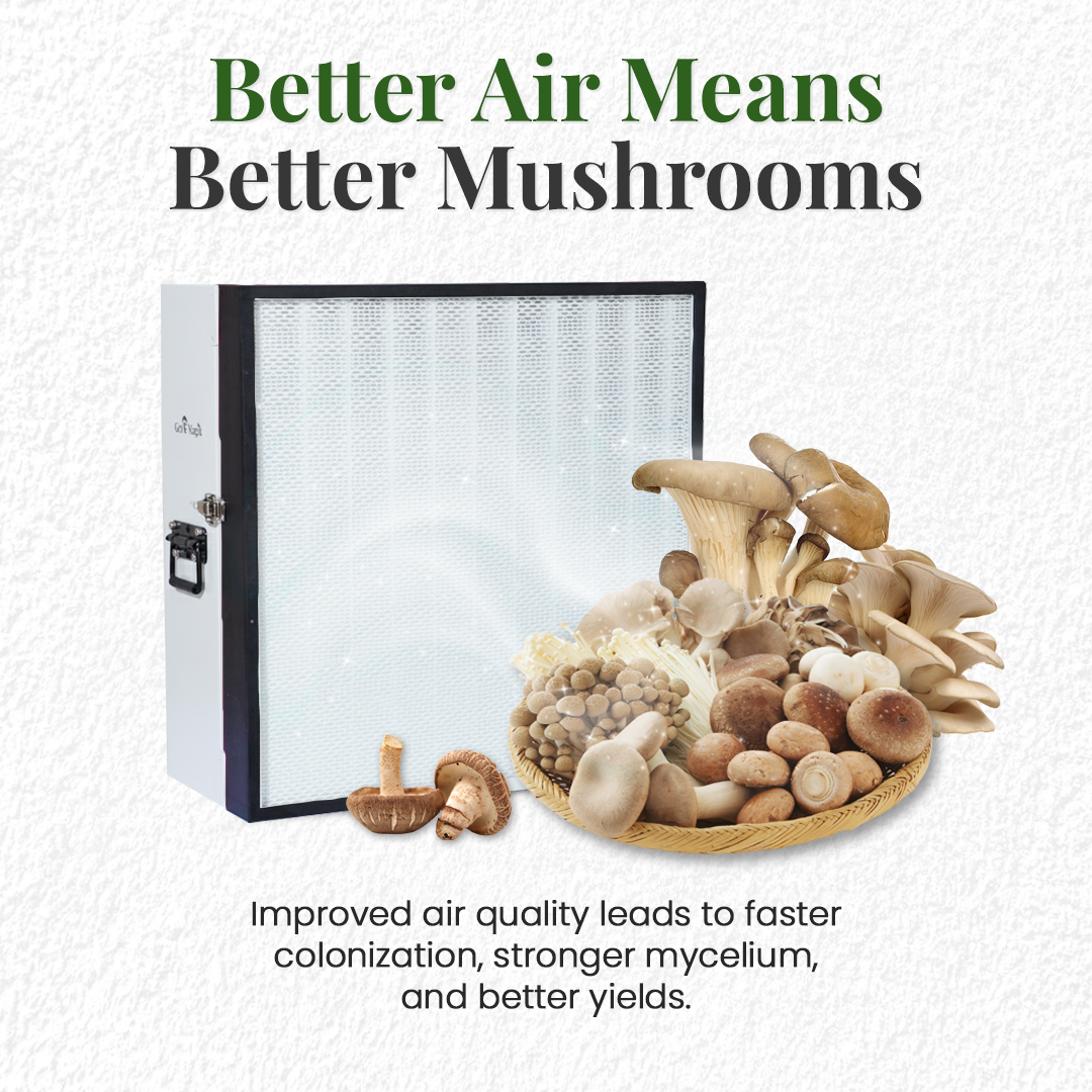 True HEPA Filter. Filters out 0.3-micron particles for ultra-clean laminar airflow which is perfect for mushroom cultivation, lab work, tissue culture, and sterile projects.